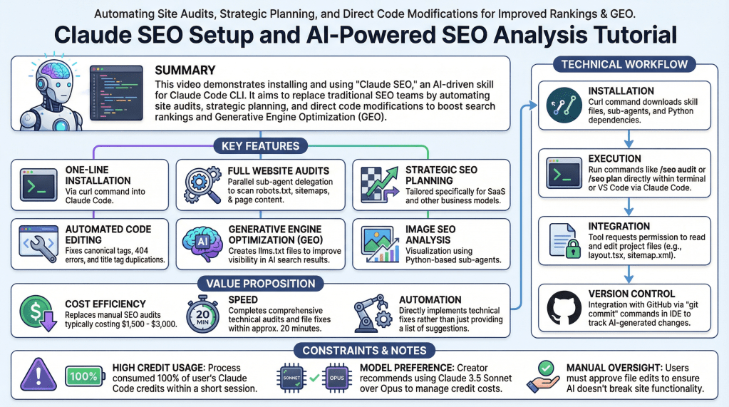 Claude SEO is a free, AI-powered SEO analysis skill that installs directly into Claude Code. It runs full site auditsm generates SEO strategies, optimizes images for search, and even performs generative engine optimization (GEO) analysis for AI Search.